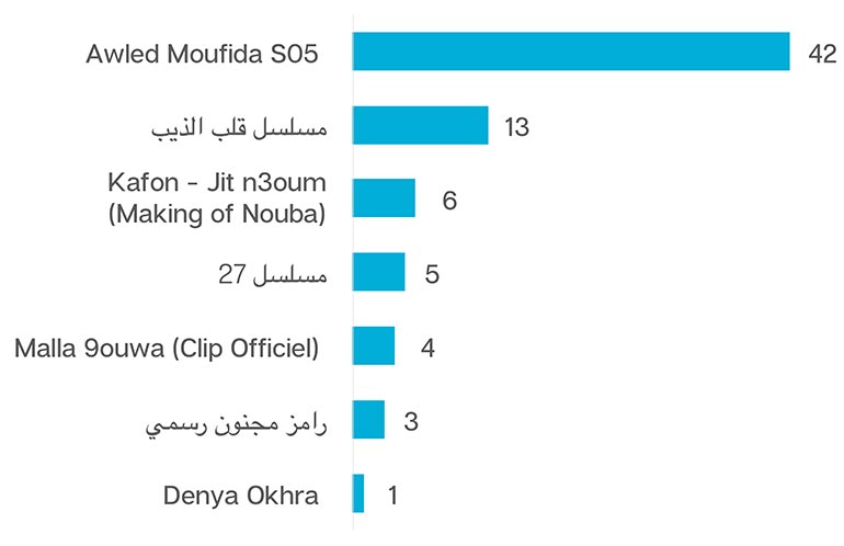 A noter qu’en date du 14/05/2020, soit 20 jours après le début du mois de Ramadan, le feuilleton « Awled Moufida » a comptabilisé un total de 24 460 290 vues et « Denya Okhra » a pu atteindre les 10 715 430 vues.